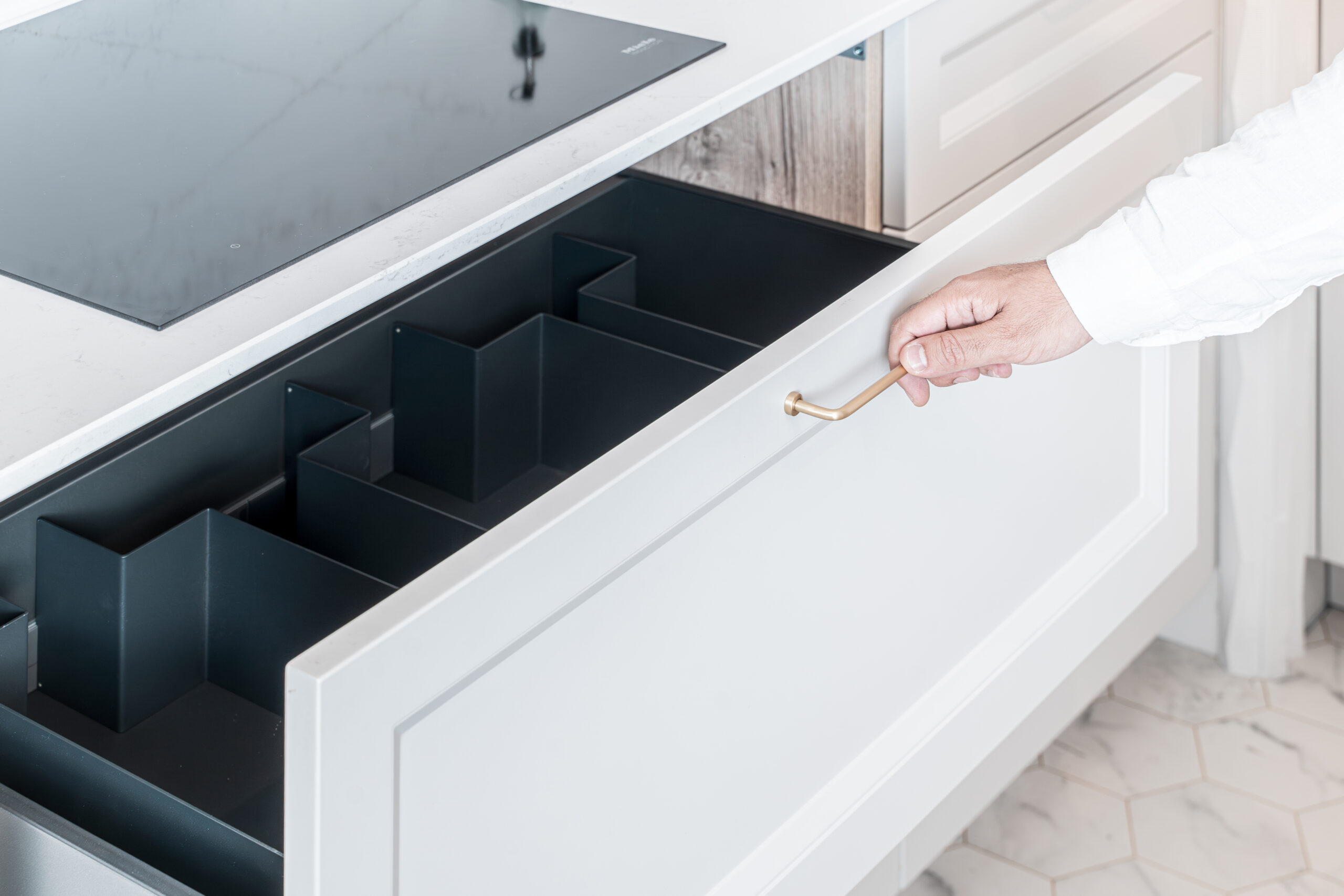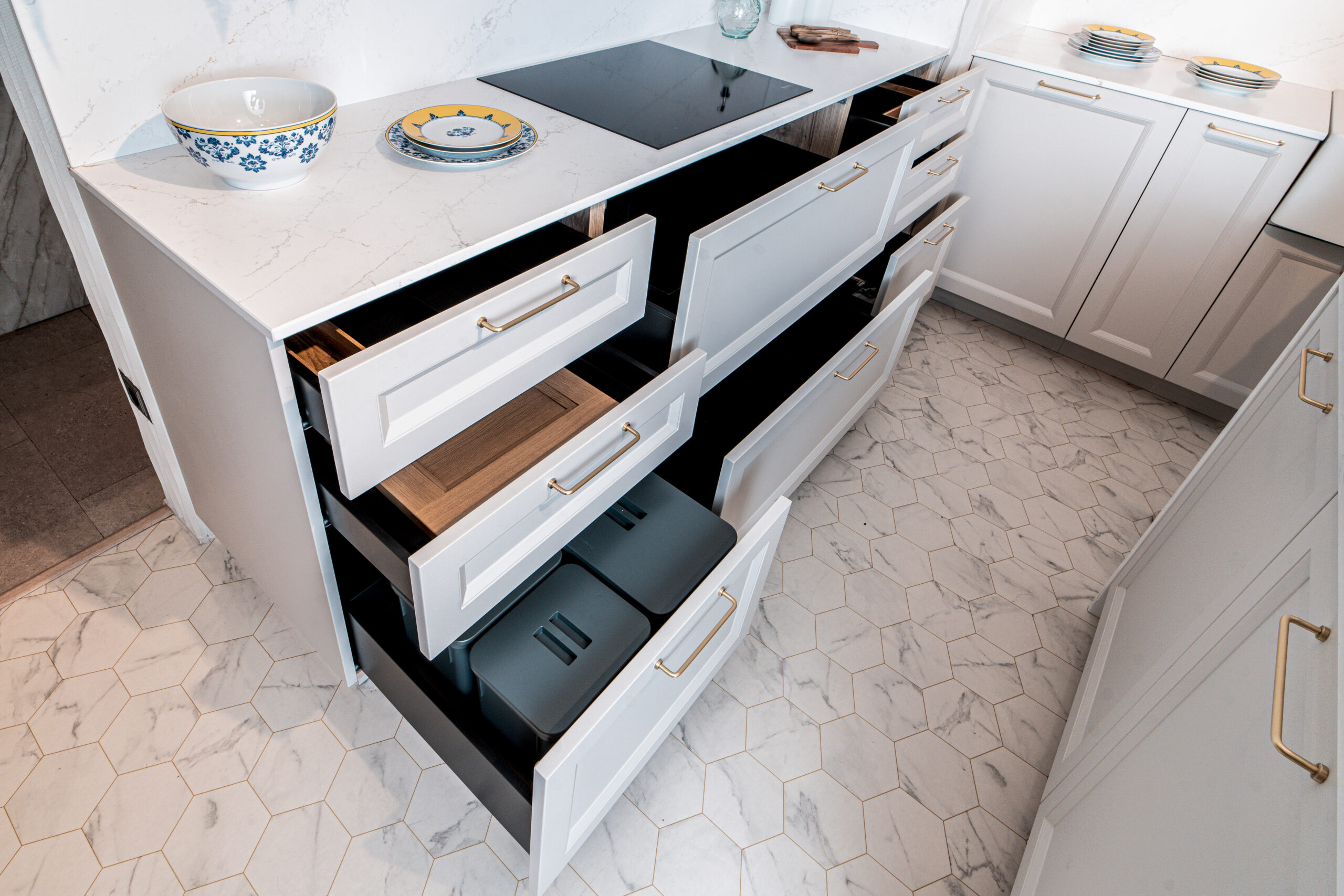 Nuestra cocina Miró no es solo preciosa, es también altamente funcional. El mueble panero y el verdulero extraíble aseguran que todo esté organizado y a mano, así como sus amplios gaveteros. Los electrodomésticos, ingeniosamente ocultos, mantienen la estética limpia y moderna del espacio. Y no podemos olvidar la campana extractora hecha a medida y la vitrocerámica de inducción, que garantizan una experiencia culinaria de primera clase.